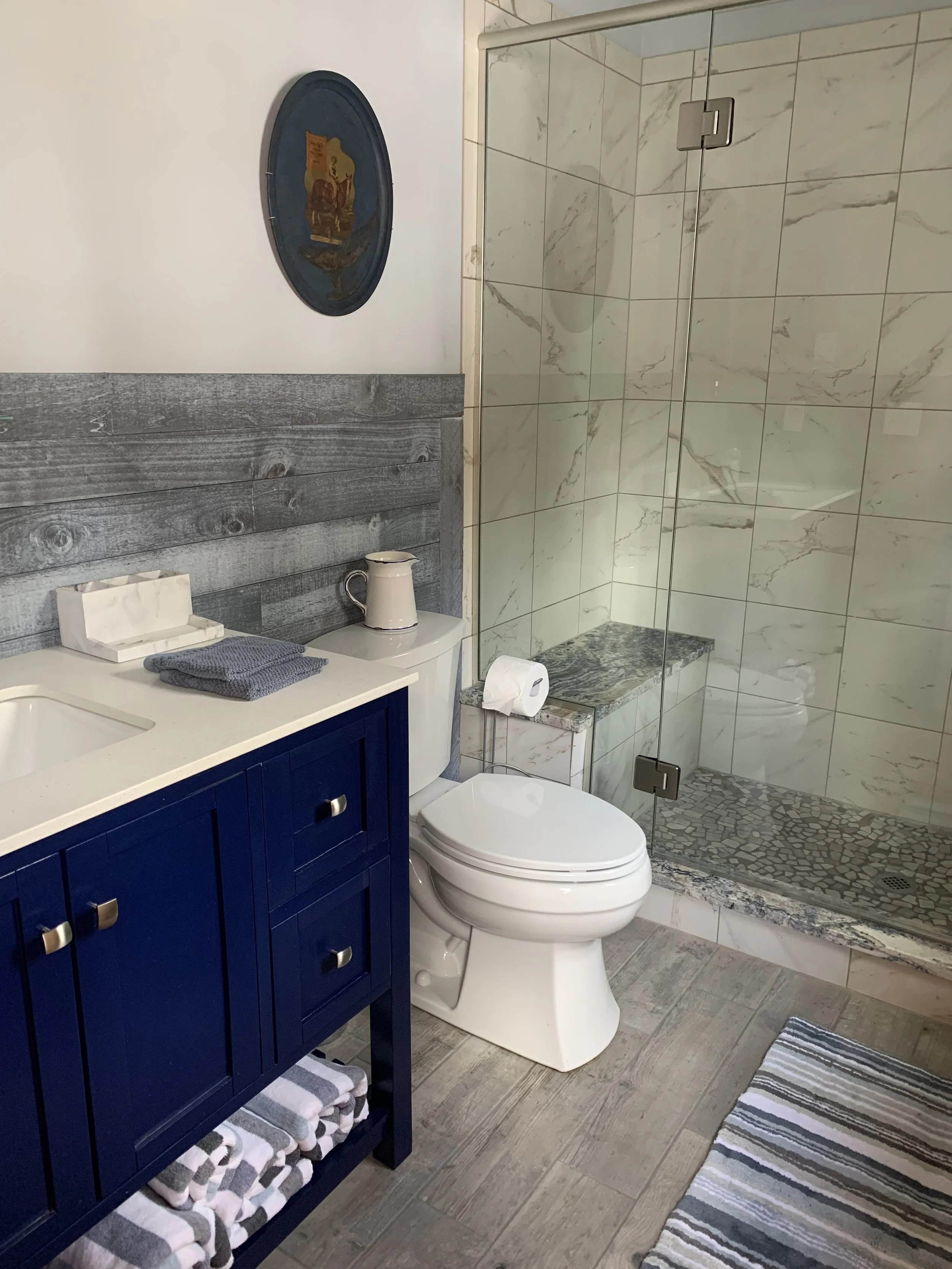Our John Wayne cabin is the perfect place to relax and unwind! Ralph Lauren bedding covers our luxurious king size bed. Allow the gas fireplace to warm you up on those cooler Montana nights or the air conditioning to cool you off on those warmer Montana days. Our front porch is the perfect place to enjoy your cup of coffee while watching our horses in their pastures or a cocktail at night under our “big sky”. Our spa bathroom features an oversize shower and on the back deck you can experience our incredible outdoor shower. There’s nothing better than our amazing Rocky Mountain views!!!